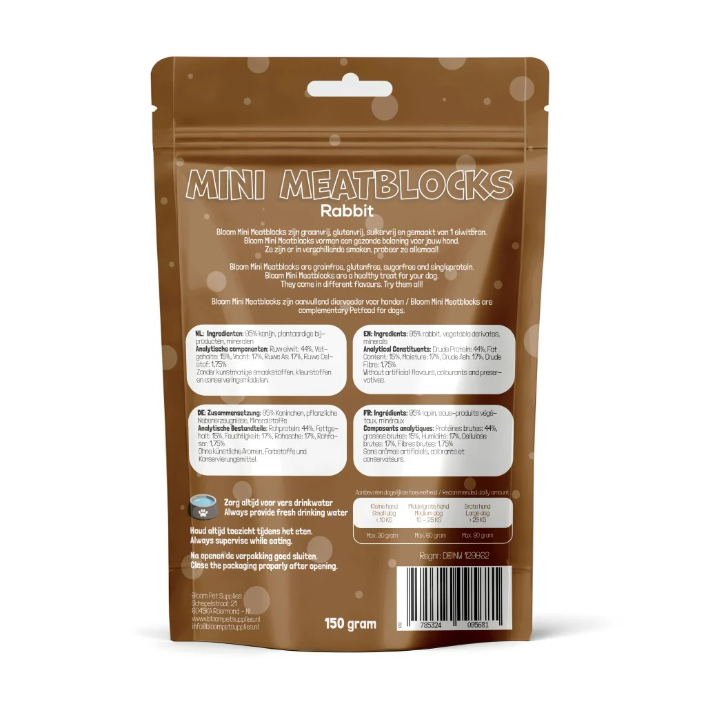 Deze Bloom Mini Meatblocks Konijn zijn kleine blokjes puur konijnenvlees, ideaal als beloning of verantwoord tussendoortje. Konijn is een hypoallergene eiwitbron en daardoor zeer geschikt voor honden met een gevoelige maag of allergieën. Of je nu traint of gewoon iets extra’s wilt geven: deze mini meatblocks zorgen voor een kwispelend blij moment.