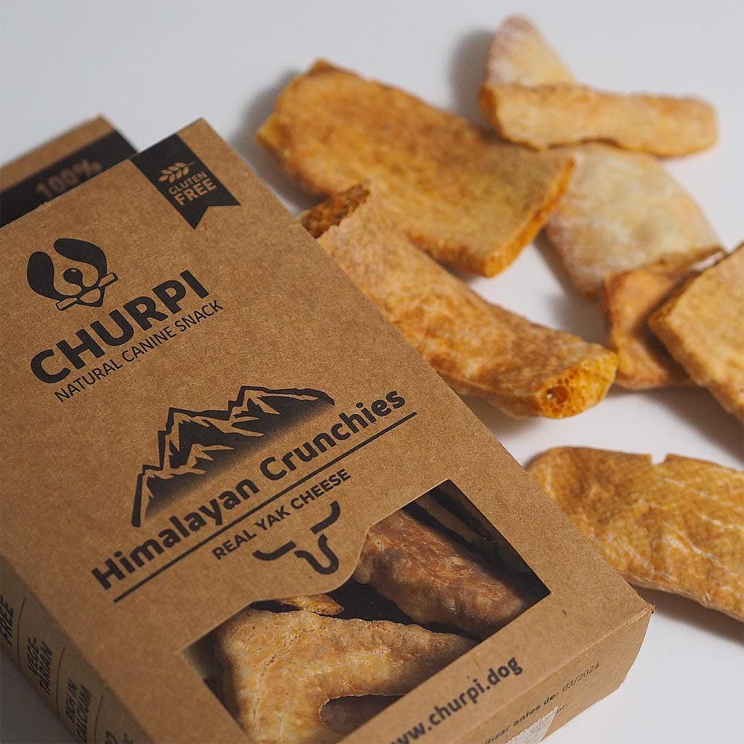 De CHURPI Himalayan Crunchies zijn het perfecte gezonde, knapperige tussendoortje voor honden. Ze worden (hand)gemaakt van yakmelk uit de Himalaya-regio en op traditionele wijze gedroogd, gerookt en gepoft. Deze crunchies zijn een goed alternatief voor de harde CHURPI-bars, vooral voor oudere honden of puppy’s met een melkgebit. Door de reepjes te verwarmen, poffen ze tot knapperige crunchies! CHURPI-crunchies bevatten geen geur-, kleur- of smaakstoffen, suikers of conserveringsmiddelen. Ze zijn glutenvrij, graanvrij en hebben een laag lactosegehalte. De CHURPI-crunchies zitten boordevolgezonde voedingsstoffen en mineralen, zoals zink, ijzer en vitamines A, B1, C, D, E en K, evenals biotine en probiotica. Yakmelk bevat maarliefst 65% proteïnen en is rijk aan calcium.