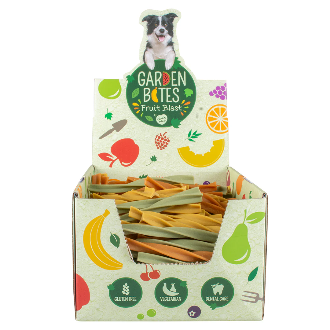 De vegetarische Garden Bites van duvoplus zijn een ideale beloning of tussendoortje voor je hond. In de Garden Bites zit maar liefst 55% zoete aardappel. Zoete aardappelen zijn een geweldige aanvulling op het dieet van je hond, ze zijn rijk aan oa. vitamines, calcium en ijzer. Deze “Fruit Blast” versie is verrijkt met heerlijke banaan, perzik & peer, dit zorgt voor een echte fruitsensatie voor je hond. Door de speciale vorm wordt spelenderwijs het tandvlees gemasseerd en de tanden gereinigd. Het natuurlijke muntextract zorgt bovendien voor een frisse adem. De snacks zijn 100% glutenvrij waardoor ze licht verteerbaar zijn en zeer geschikt zijn voor honden met allergieën. De leuke vormen maken deze snacks compleet onweerstaanbaar!