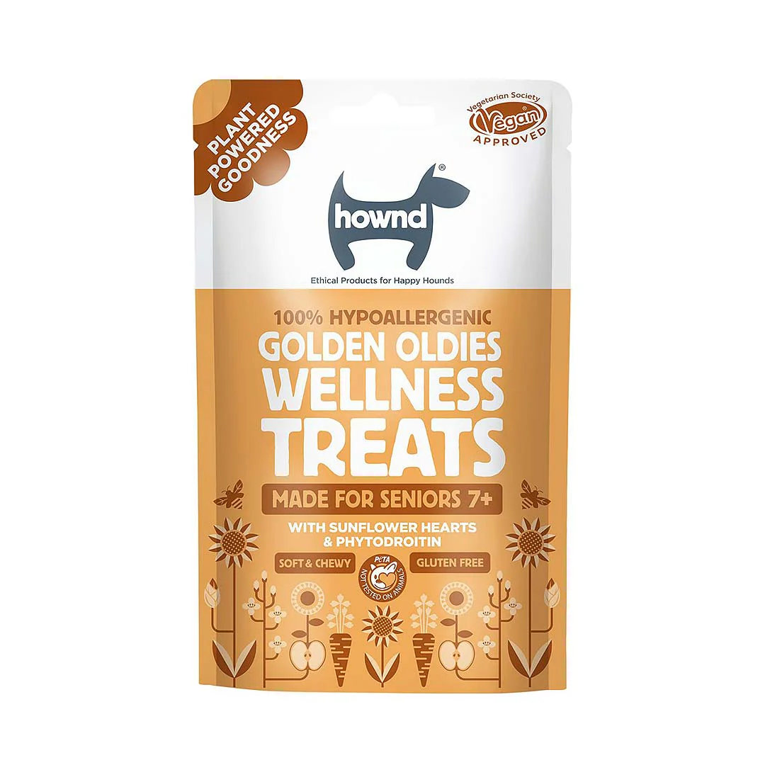 De HOWND Golden Oldies Wellness Treats kunnen stijfheid van gewrichten bij oudere honden verminderen en helpen het kraakbeen te ondersteunen. Phytodroitin (een plantaardig alternatief voor commerciële Chondroitine afkomstig van haaienvinnen en runderkraakbeen), helpt de gewrichten van de hond soepel te houden, terwijl glucosamine helpt bij het herstel van het kraakbeen. Deze traktaties zijn rijk aan vezels, ijzer en calcium dankzij het erwtenmeel, en bevatten cichoreiwortel, bekend om zijn positieve effecten op het immuunsysteem. Bovendien dragen de zonnebloempitten bij aan de hartgezondheid en de algehele vitaliteit van honden. De Wellness Treats van HOWND zijn hypoallergeen, gemaakt met natuurlijk ingrediënten, glutenvrij en 100% plant powered. Geschikt voor honden met vlees- en zuivelallergieën. Geen GMO’s (Genetisch Gemodificeerd Organisme). Geen tarwe. Geen soja. Geen toegevoegde geur-, kleur- en smaakstoffen, suikers of vul- en conserveringsmiddelen.