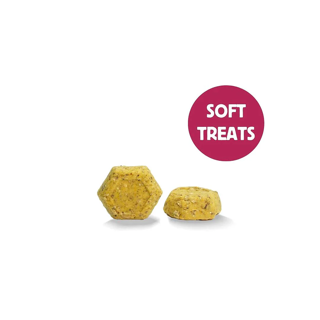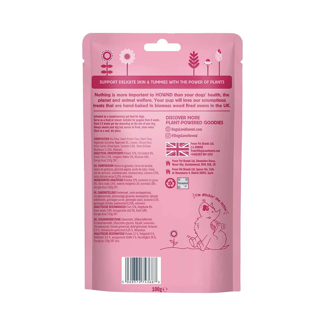 Een jeukende huid kan leiden tot overmatig likken, ongemak en irritatie. De HOWND Got An Itch? Wellness Treats bevatten de krachtige combinatie van kurkuma en shiitake-paddenstoelen. Kurkuma is een magisch kruid dat het actieve bestanddeel curcumine bevat, dat antioxidantische eigenschappen heeft. Het helpt bij het ondersteunen van een gezonde huid en vacht, en kan verlichting bieden bij jeuk. De shiitake-paddenstoelen helpen het immuunsysteem te beschermen en hebben naar verluidt ontstekingsremmende effecten. De Wellness Treats van HOWND zijn hypoallergeen, gemaakt met natuurlijk ingrediënten, glutenvrij en 100% plant powered. Geschikt voor honden met vlees- en zuivelallergieën. Geen GMO’s (Genetisch Gemodificeerd Organisme). Geen tarwe. Geen soja. Geen toegevoegde geur-, kleur- en smaakstoffen, suikers of vul- en conserveringsmiddelen.