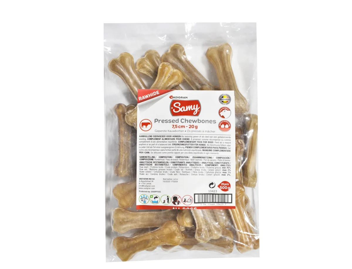 De geperste kauwbotten voor honden bestaan uit 100% runderhuid. Het is een vetarme snack voor honden, rijk aan eiwitten en heel natuurlijk – zonder toevoeging van bewaarmiddelen, aroma’s of kleurstoffen.