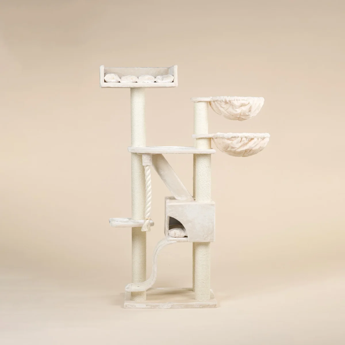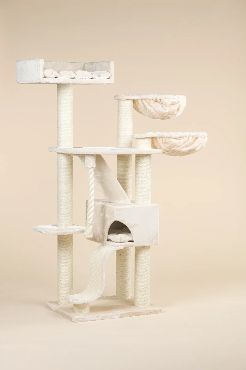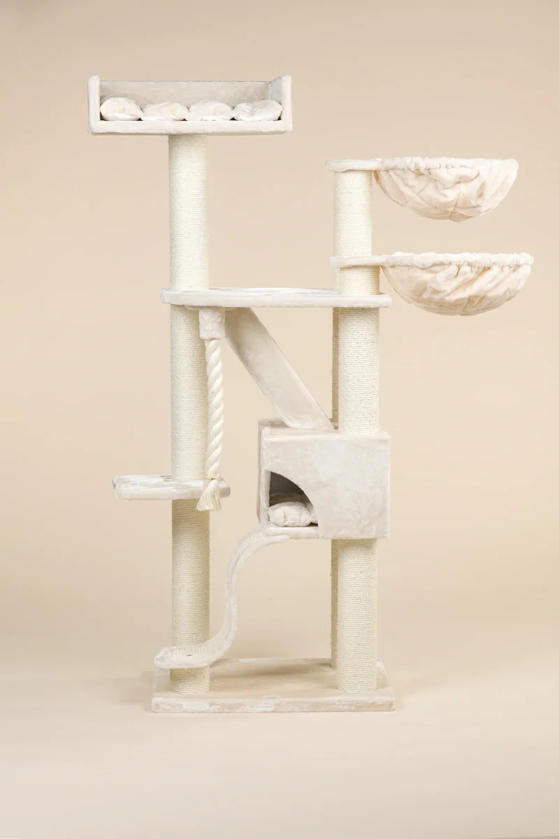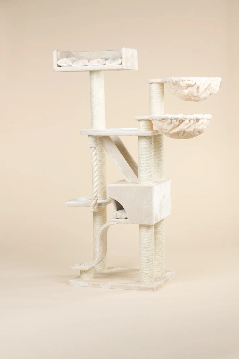 De Kilimandjaro de Luxe Plus crème krabpaal is een van de meest populaire krabpalen. Met veel lig en speelplekken is dit de wens van iedere kat. Door de sisalpalen van wel 12 cm dik is deze enorm stabiel en stevig. Hierbij komt ook nog een mega grote Lounge ligbak van 60 cm x 43 cm, twee heerlijk zachte hangmatten van wel 45 cm doorsnee en een mega groot verstophuis. Perfect voor grote (ras)katten en energieke kittens.