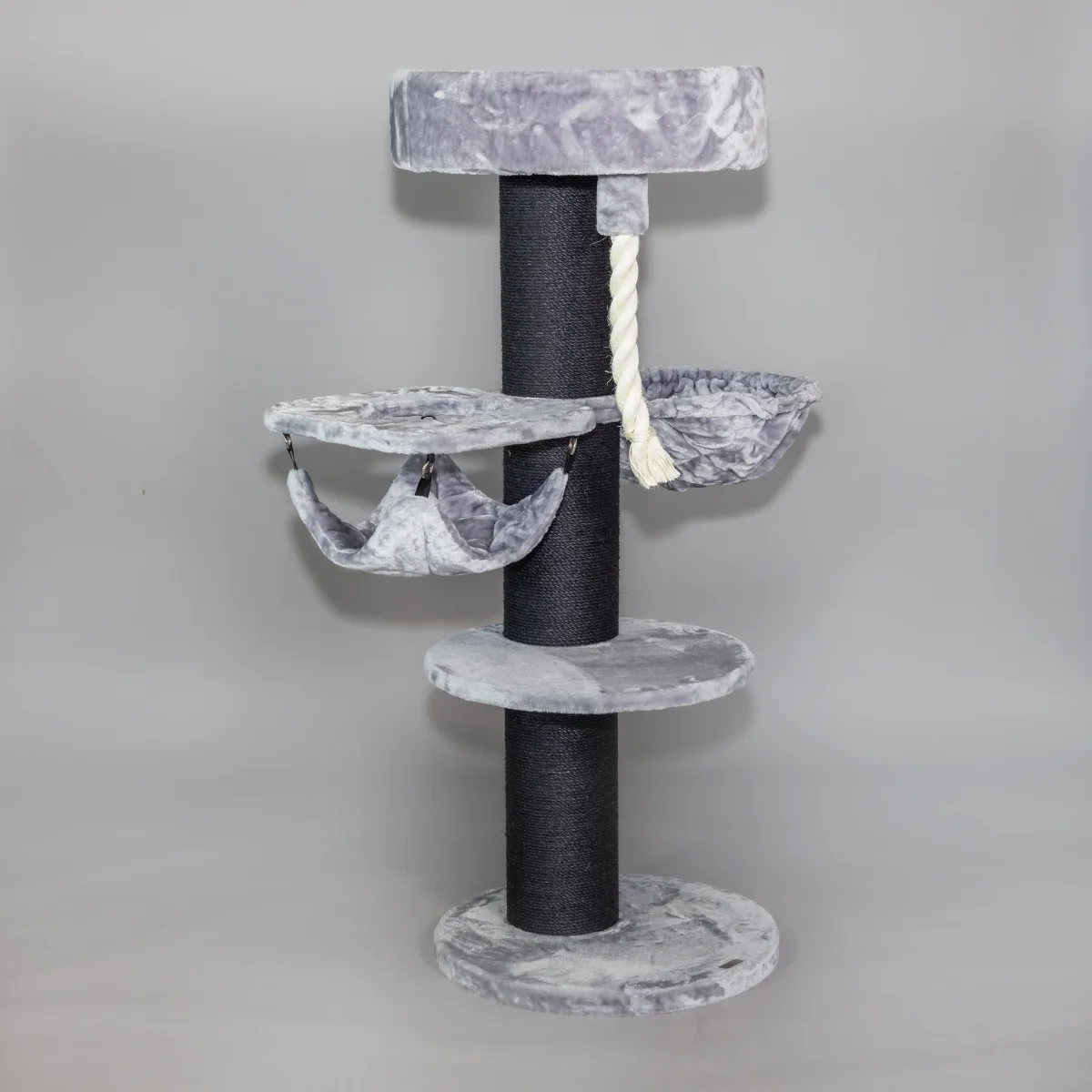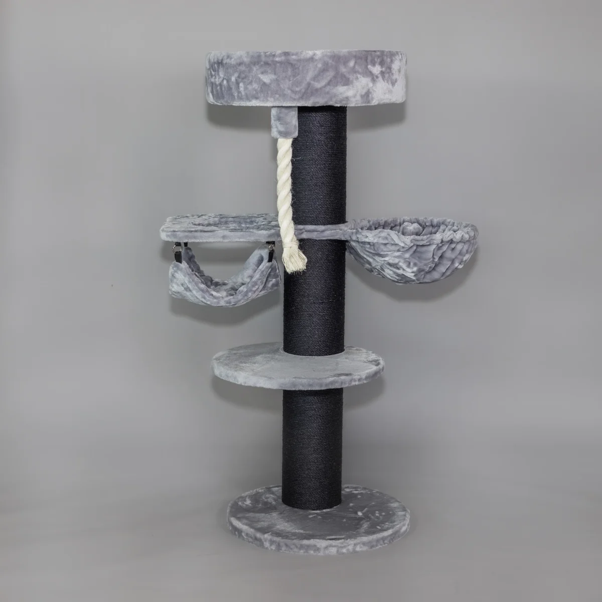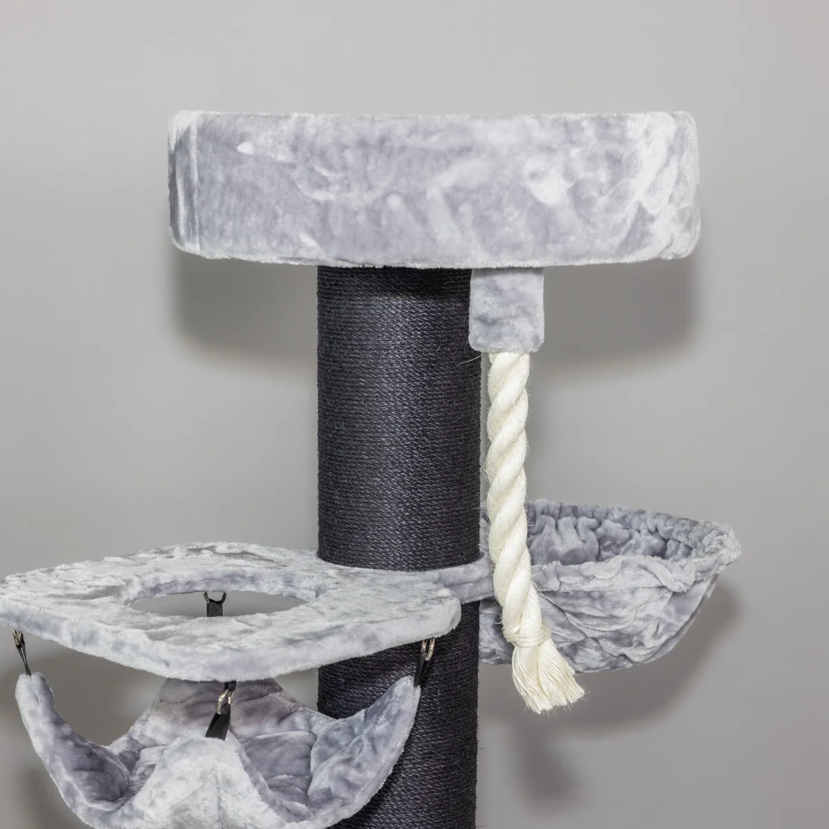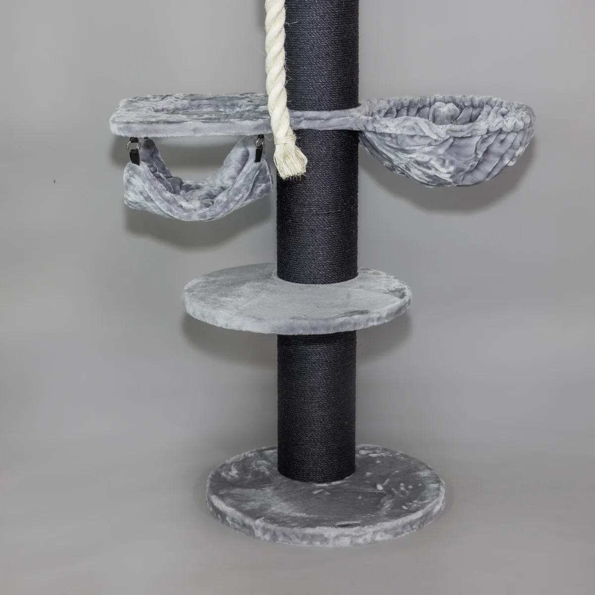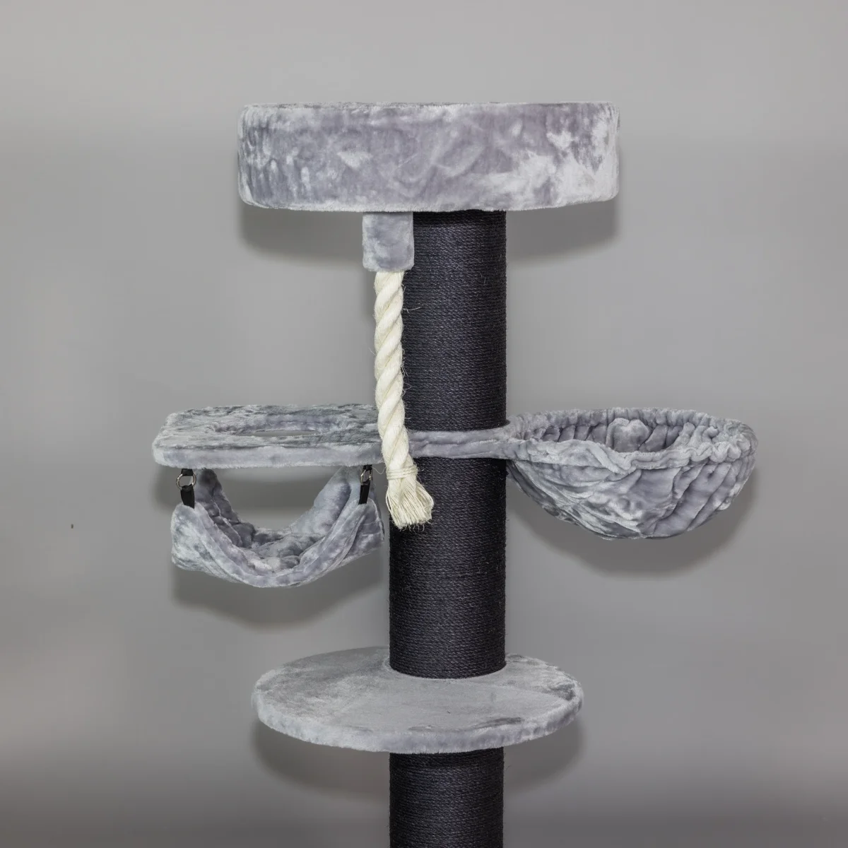 De Maine Coon Sleeper Crown Plus Blackline Lichtgrijs is met zijn 20 cm dikke sisalpalen, 1 Crown welke een combinatie is van een ligplaats en een hangmat, 1 Hangmat de Luxe en 1 mega ligplaats een must-have krabpaal voor elke grote kat. De grote zetel van wel 60 cm in diameter geeft zelfs de grootste raskat een plek om te genieten. Vanaf de zetel, die op ca. 1.5 meter hoog staat, kan uw kat het domein in de gaten houden. Het van natuurlijk sisal gefabriceerde speeltouw maakt deze krabpaal helemaal af!