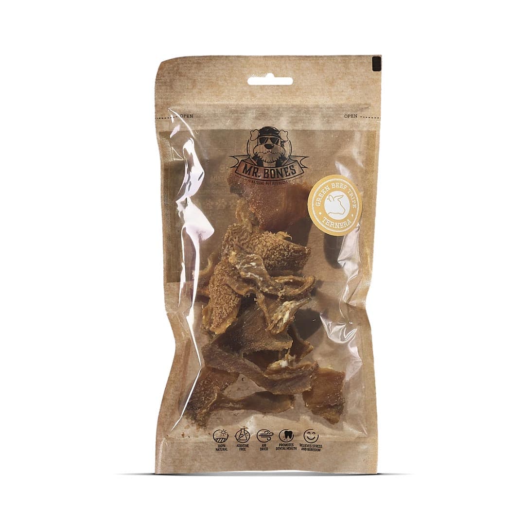 Niet de mooiste snack, wel één waar je hond direct op afgaat. De groene runderpens van Mr. Bones zijn knapperige stukjes met een intense geur die honden meteen herkennen. Precies zo’n snack die altijd werkt, of je ’m nu gebruikt als beloning of tussendoor geeft.