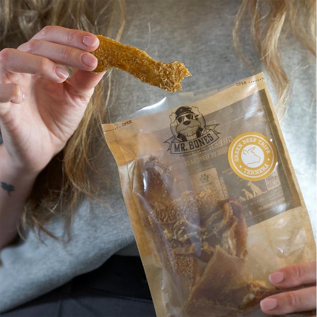 Gemaakt van runderen uit Spanje en zorgvuldig geselecteerd. De pens wordt niet gebleekt of bewerkt, waardoor hij zijn natuurlijke kleur, geur en voedingsstoffen behoudt. Dat is precies waarom het ‘groene’ runderpens heet en wat deze snack zo anders maakt dan andere varianten.