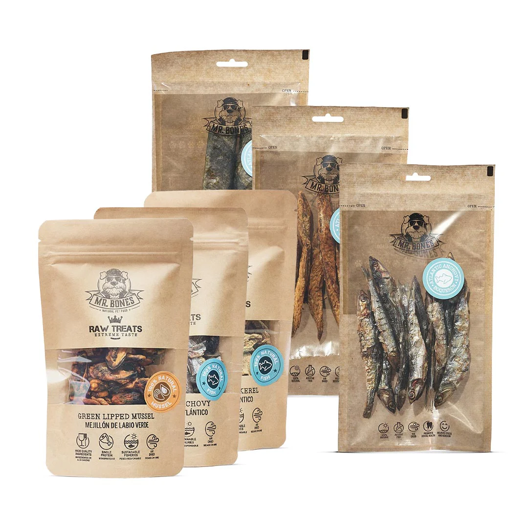 Ontdek de kracht van de zee met de Mr. Bones Sea Treats bundel! Deze exclusieve selectie bevat een gevarieerde mix van natuurlijke vistraktaties: Raw Treats van groenlipmossel, Atlantische makreel en ansjovis, aangevuld met hele ansjovissen, makreelfilets en zalmrolletjes – allemaal zorgvuldig gedroogd om smaak en voedingsstoffen optimaal te behouden.