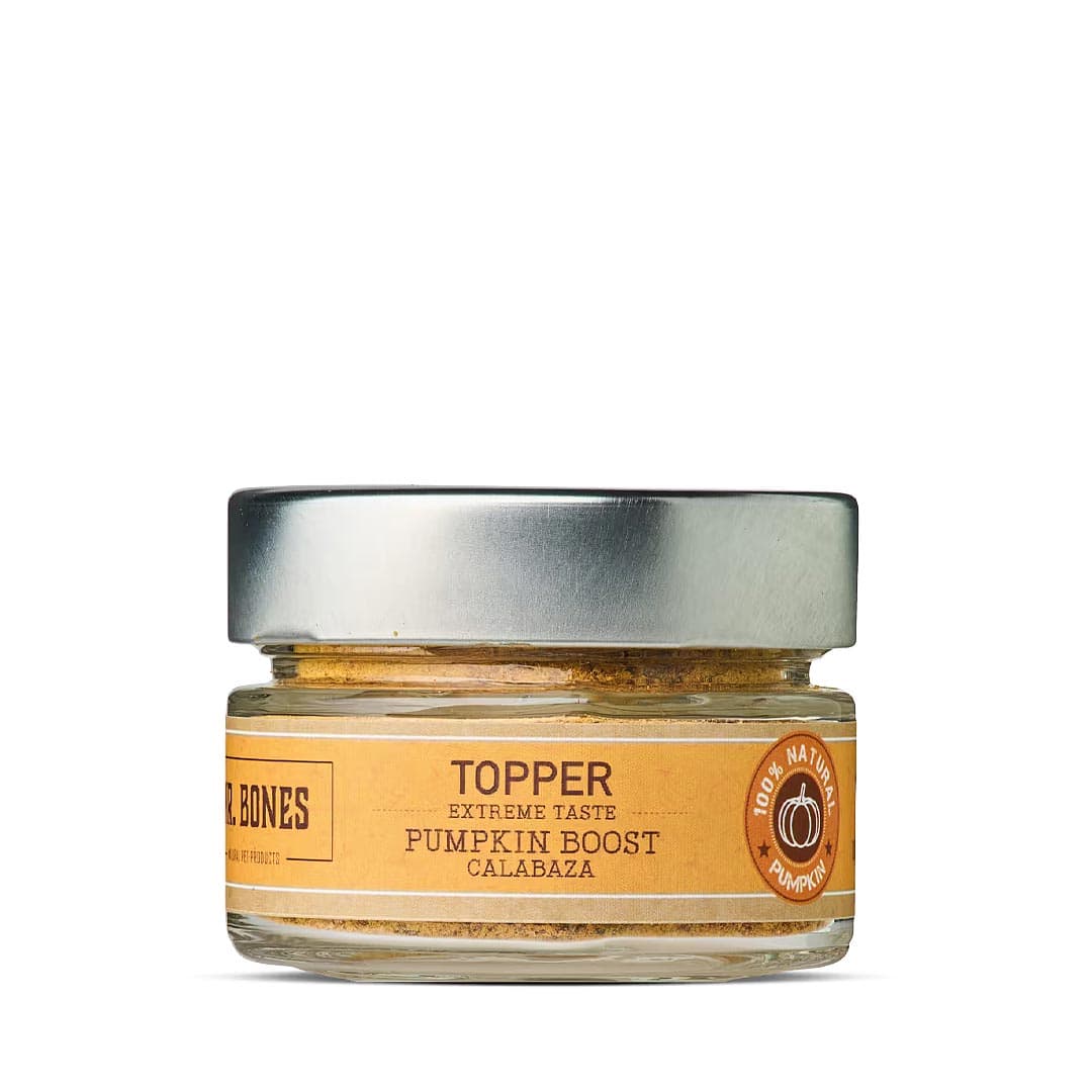 Voor de Pumpkin Boost gebruikt Mr. Bones 100% pompoen, langzaam gedroogd en fijngemalen tot zachte kruimels die je makkelijk doseert en moeiteloos door elke maaltijd mengt. Geen granen, geen kunstmatige toevoegingen, alleen pure pompoen.