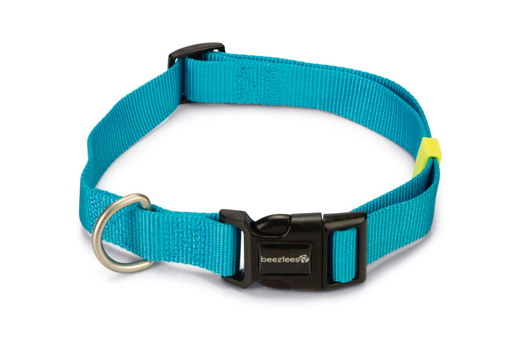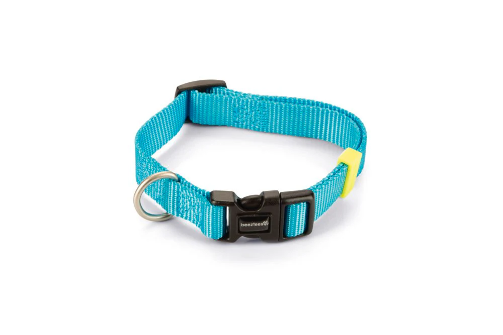 Met de Beeztees Uni hondenhalsband komt jouw hond flitsend voor de dag. Deze eenvoudige en effectieve halsband is gemaakt van sterk nylon en is verstelbaar. De halsband is voorzien van een soort rubberen gespje in een felle kleur, wat zorgt voor een vrolijk accent. De halsband kan gemakkelijk worden vastgemaakt door middel van de kliksluiting. Ook bevat de halsband een verchroomde ring, waaraan verschillende hondenriemen kunnen worden bevestigd.