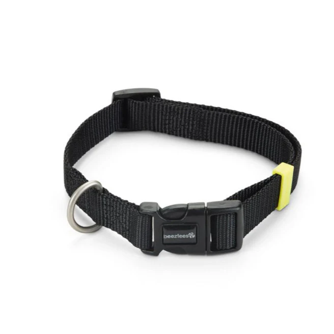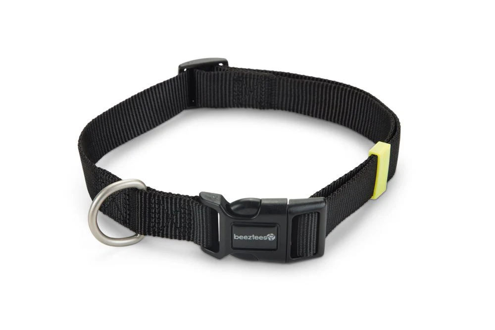 Met de Beeztees Uni hondenhalsband komt jouw hond flitsend voor de dag. Deze eenvoudige en effectieve halsband is gemaakt van sterk nylon en is verstelbaar. De halsband is voorzien van een soort rubberen gespje in een felle kleur, wat zorgt voor een vrolijk accent. De halsband kan gemakkelijk worden vastgemaakt door middel van de kliksluiting. Ook bevat de halsband een verchroomde ring, waaraan verschillende hondenriemen kunnen worden bevestigd.