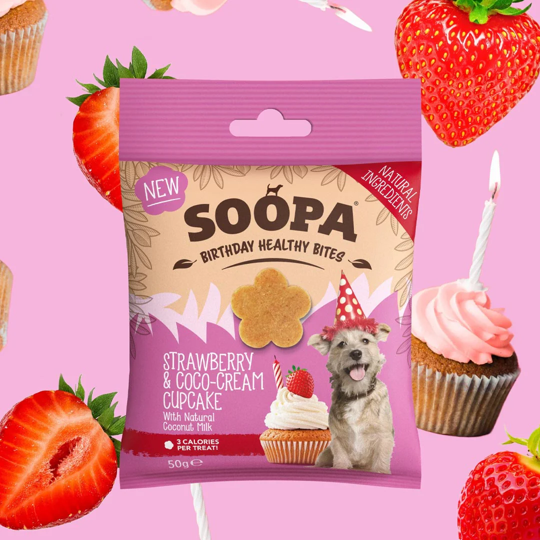 Woef, woef, hoera! Je hond verdient een snack die niet alleen lekker is, maar ook bijdraagt aan zijn gezondheid! Soopa Healthy Bites Aardbei & Coco-Cream Cupcake zijn gemaakt van pure, natuurlijke ingrediënten en boordevol echte superfoods. Deze graanvrije, hypoallergene minibites zijn laag in calorieën, licht verteerbaar en perfect als gezonde beloning voor thuis, onderweg, tijdens training of gewoon tussendoor. Simpel, smakelijk, voedzaam – en het allerbelangrijkste: honden zijn er DOL op!