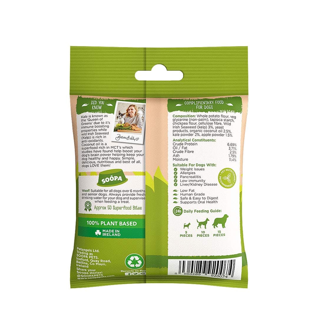 Je hond verdient een snack die niet alleen lekker is, maar ook bijdraagt aan zijn gezondheid! Soopa Healthy Bites Boerenkool & Appel zijn gemaakt van pure, natuurlijke ingrediënten en zitten boordevol echte superfoods. Deze graanvrije, hypoallergene minibites zijn laag in calorieën, licht verteerbaar en perfect als gezonde beloning voor thuis, onderweg, tijdens training of gewoon tussendoor. Simpel, smakelijk, voedzaam – en het allerbelangrijkste: honden zijn er DOL op!