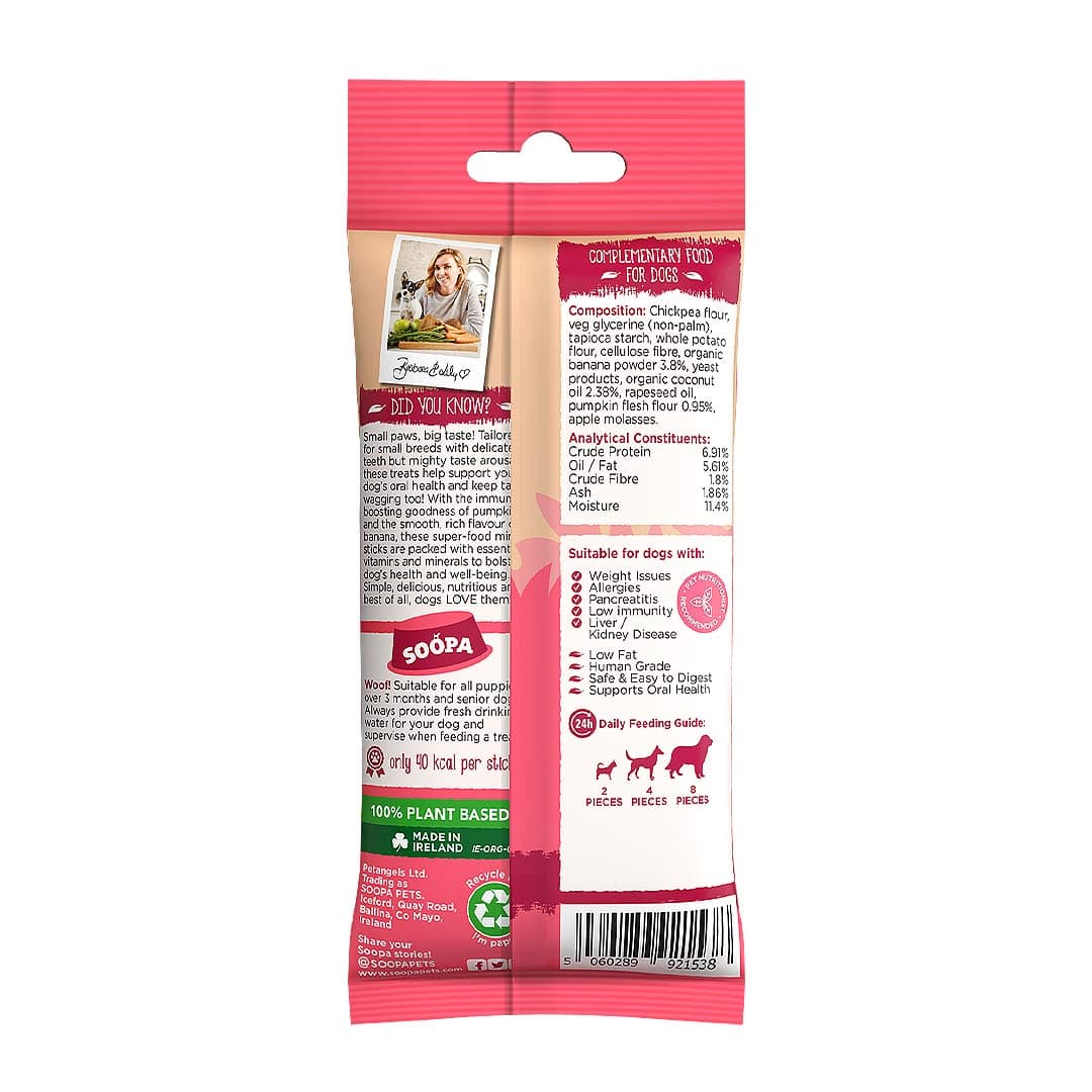 Voor de kleinste pootjes, maar groot van smaak! Soopa Mini Dental Sticks Banaan & Pompoen zijn speciaal ontwikkeld voor kleine rassen. Deze graanvrije, hypoallergene sticks zijn gemaakt van natuurlijke superfoods en ondersteunen op een zachte manier de mondgezondheid van je hond. Laag in calorieën, licht verteerbaar en onweerstaanbaar lekker – perfect als verantwoorde dagelijkse beloning voor kleine viervoeters.