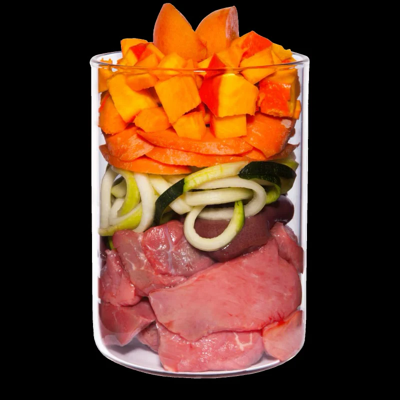 - Verhouding: vlees 59%, groenten/fruit/kruiden 38% andere ingrediënten 3%