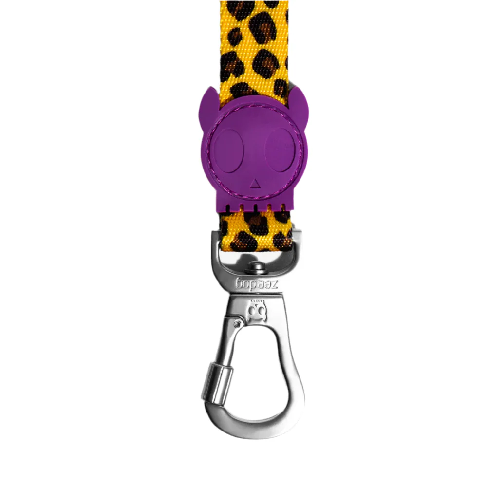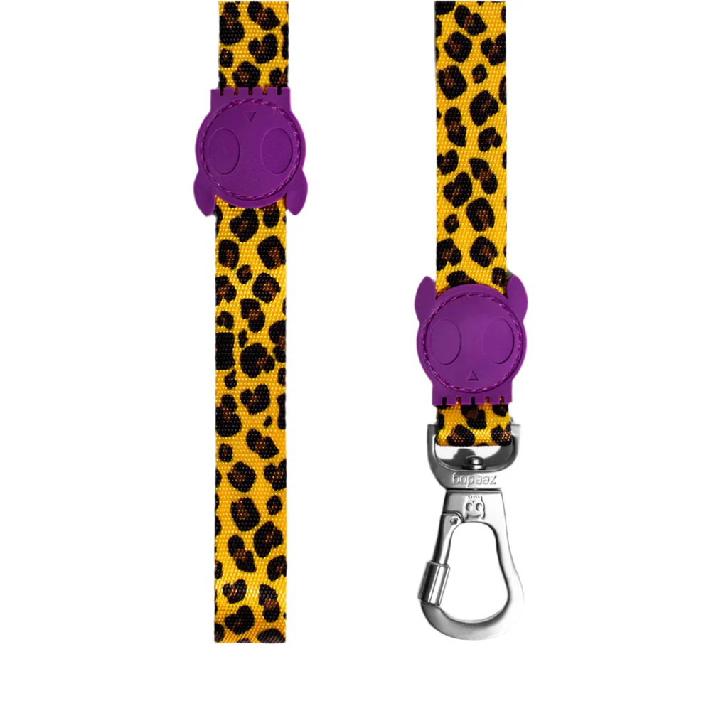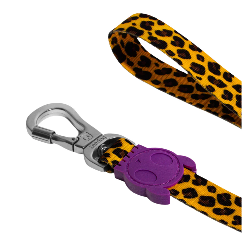 Maak elke wandeling bijzonder met de Honey hondenlijn van Zee.Dog. Met een warme goudgele panterprint, verfijnde bruin-zwarte vlekken, speelse paarse accenten en een zilverkleurige karabijnhaak, combineert deze lijn stijl en functionaliteit moeiteloos. Perfect voor baasjes die oog hebben voor detail en design