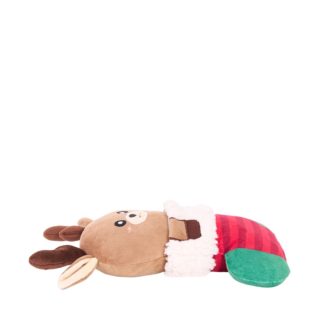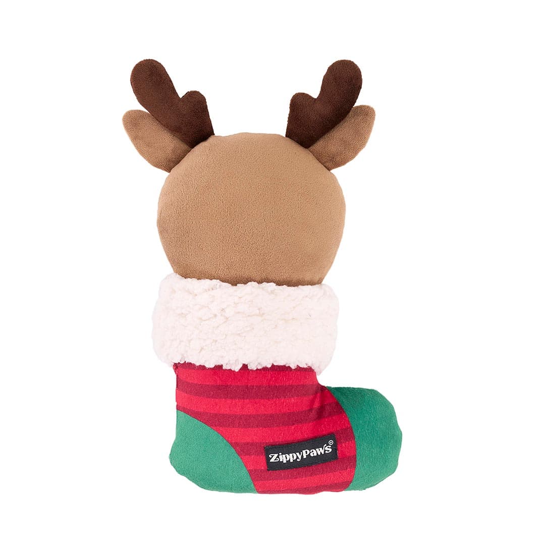 Het is kerst en jouw hond mag natuurlijk ook meegenieten van de feestvreugde! De ecoZippy Holiday Stocking Reindeer brengt de knusse wintermagie rechtstreeks naar de speelgoedmand. Dit vrolijke rendier verstopt zich in een zachte kerstsok met een heerlijk zachte, wollige rand die extra knus aanvoelt en zorgt voor verrassende textuur. Zijn geborduurde pootjes steken nieuwsgierig uit de sok, klaar om te spelen, te piepen en te knuffelen.