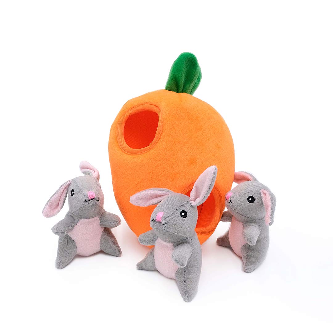 Je viervoeter vindt het fantastisch om met zijn neus in de ZippyPaws Zippy Burrow Bunny ’n Carrot te duiken! Dit vrolijke, interactieve verstopspeeltje bestaat uit een grote, oranje wortel met drie kleine, piepende grijze konijn-Miniz. Verstop de konijntjes in de wortel en jouw hond probeert ze er één voor één weer uit te halen. Zijn alle Miniz gevonden? Dan begint het verstoppen gewoon opnieuw – voorkom verveling en bevorder mentale stimulatie, speelplezier gegarandeerd!